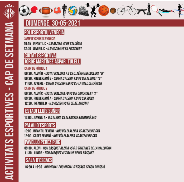 Per a hui diumenge aquesta programades diverses activitats esportives que pots consultar en la relació adjunta