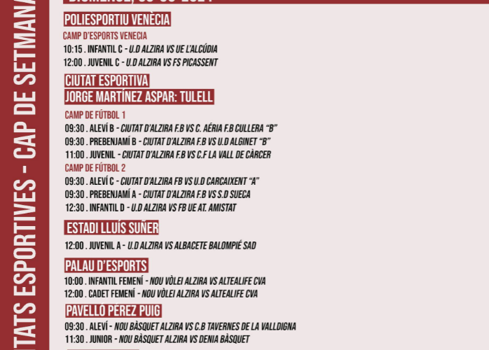 Per a hui diumenge aquesta programades diverses activitats esportives que pots consultar en la relació adjunta