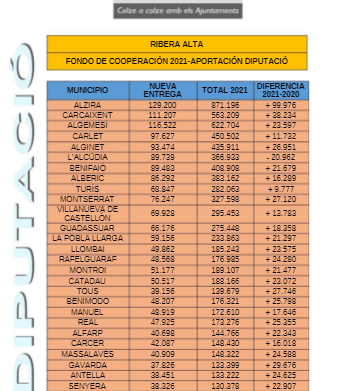 - Amb esta tercera entrega, els municipis de La Ribera Alta hauran rebut 8,7 milions d’euros en 2021, pels 3,5 de La Ribera Baixa. En total, 1,4 milions d’increment respecte al Fons de 2020