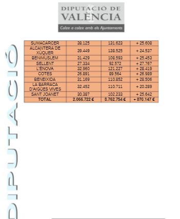 La Diputació prepara una nova entrega que elevarà a 12,3 milions la seua aportació al Fons de Cooperació en els municipis de La Ribera