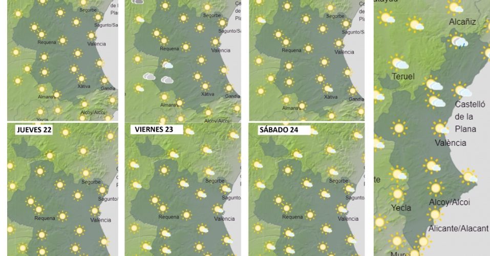 DIJOUS 22: Predomini de cel poc nuvolós o buidat amb núvols baixos al matí en el litoral. En la meitat sud, possible calitja en zones altes. Temperatures mínimes sense canvis significatius i màximes en lleuger ascens fins als 38° a l’interior. A la ciutat de València les mínimes rondaran els 23é i les màximes 31é. Vent fluix variable amb brises marítimes.