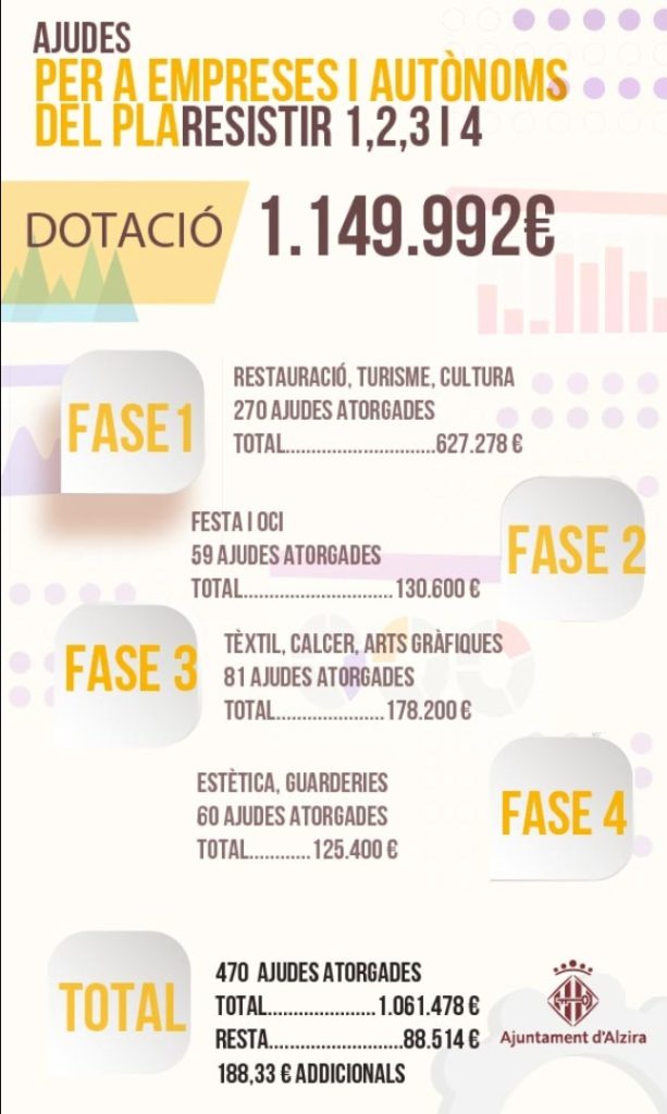 Alzira ha completat ja la liquidació de la quarta fase d’este Pla i la Comissió de valoració ha aprovat el repartiment de manera equitativa d’un romanent de 88.514 euros, entre els beneficiaris, 464 empreses i autònoms subvencionats. “Hem decidit el repartiment del romanent de forma proporcional entre els beneficiaris de les 4 fases, que suposarà una quantitat de vora 200 euros addicionals” ha explicat l’alcalde de la ciutat, Diego Gómez. “A més -afig- cal donar viabilitat als diferents sectors, dins del que ens ha permés la legislació sobre els destinataris del Pla Resistir”