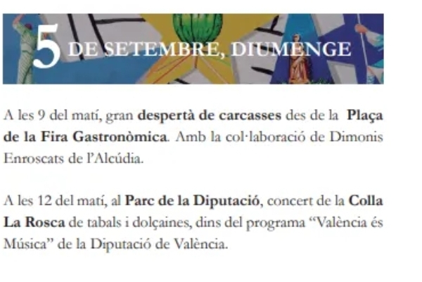 12:00: al Parc de la Diputació, concert de la Colla La Rosca de tabals i dolçaines, dins del programa «València és Música» de la Diputació de València.