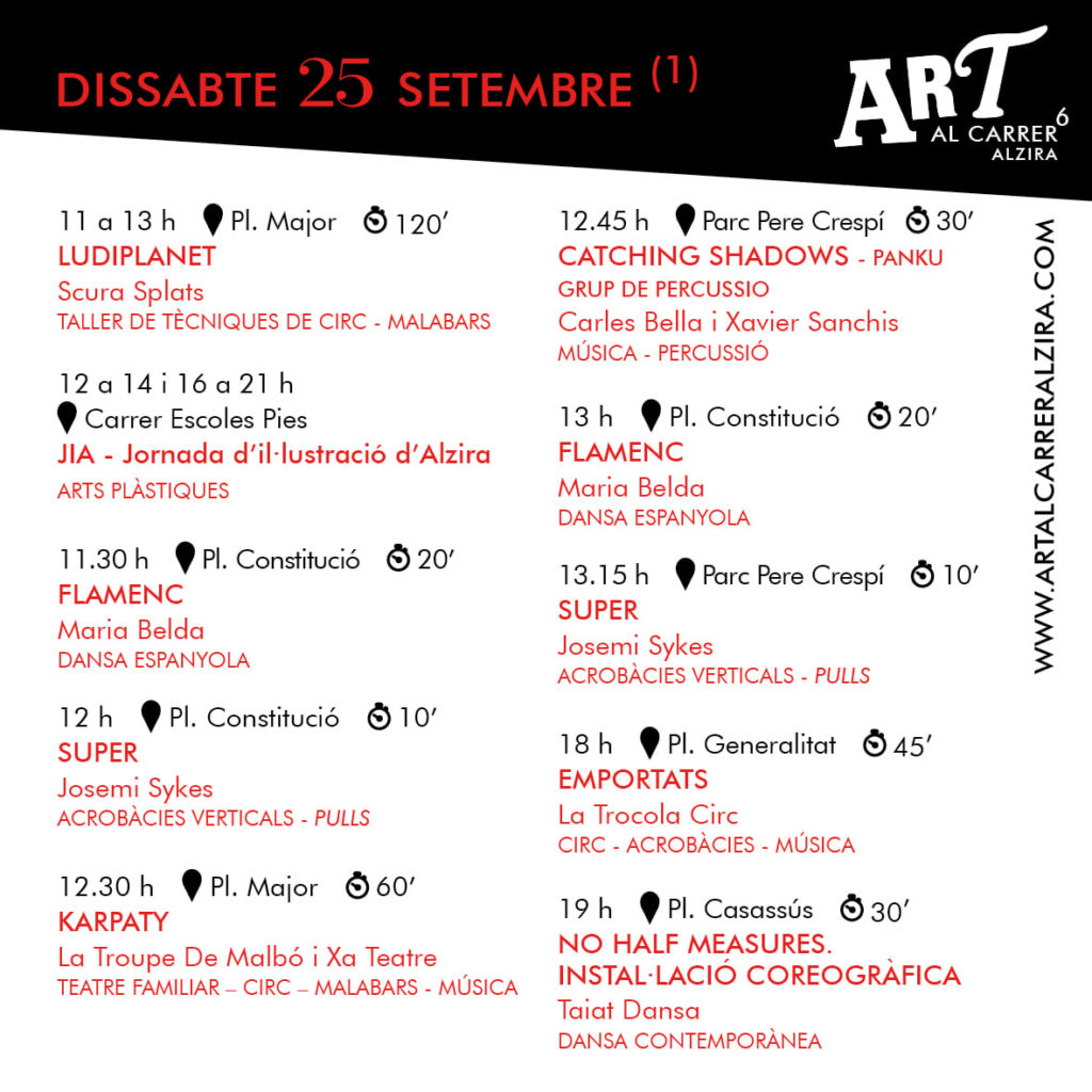 Anterior Nuevo ataque homófobo a Alzira Pròxim Alzira punt de partida del 59 Descens del Xúquer actualitat Segunda jornada de Art al Carrer a Alzira 25 septiembre, 20211 minuts vists Comentar Facebook Twitter WhatsApp Correu electrònic Hoy sábado continua la programación de Art al carrer programado desde la regidoría de cultura del ayuntamiento de Alzira. Esperemos que hoy el tiempo de una tregua y se pueda disfrutar de los espectáculos programados plano art al carrer ALZIRA art al carrar cultura FESTA societat Fina Valiente Vore totes les publicacions També et pot agradar actualitat 🎬👀 Programació Festes de la Mare de Déu de la Salut Algemesí 2024 5 minuts vists actualitat #FiraiFestesSueca2024, Presentacio Festera Major 1 minuts vists actualitat, Cultura, festes, Societat 👀🎞La novena i els assajos inicien l’agenda de les Festes de la Mare de Déu de la Salut 3 minuts vists Comentar Cancelar la respuestaTu dirección de correo electrónico no será publicada. Los campos obligatorios están marcados con *Comentario Nombre * Correo electrónico * Web Δ MAIGMAYO 12M12E CAMARENA eterniajoyeria novembre Idea 12 EMPRESES 12 COMERÇOS. JSR_ novembre Idea 12 EMPRESES 12 COMERÇOS.Asociación Empresarial AlziraDia de Promocions Especials