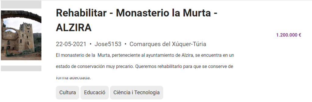 - Proposta d’inversió acceptada: Rehabilitar – Monasterio la Murta – ALZIRA 591 1.200.000 € 7.707.300 €