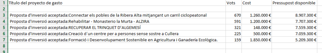 - Proposta d’inversió acceptada: RECUPERAR EL TRINQUET D’ALGEMESÍ 321 148.000 € 7.559.300 €
