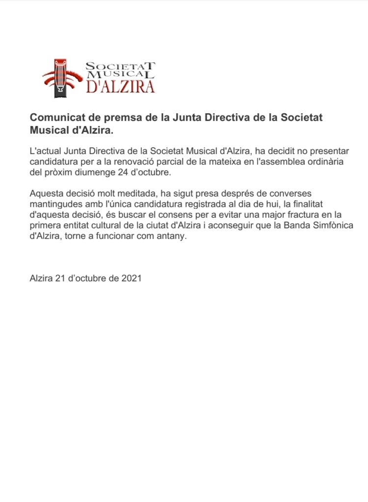 L’Actual junta de la Societat Musical Alzira no presentará candidatura i busca el consens segons un comunicat de premsa rebut recentment de la Junta Directiva.
