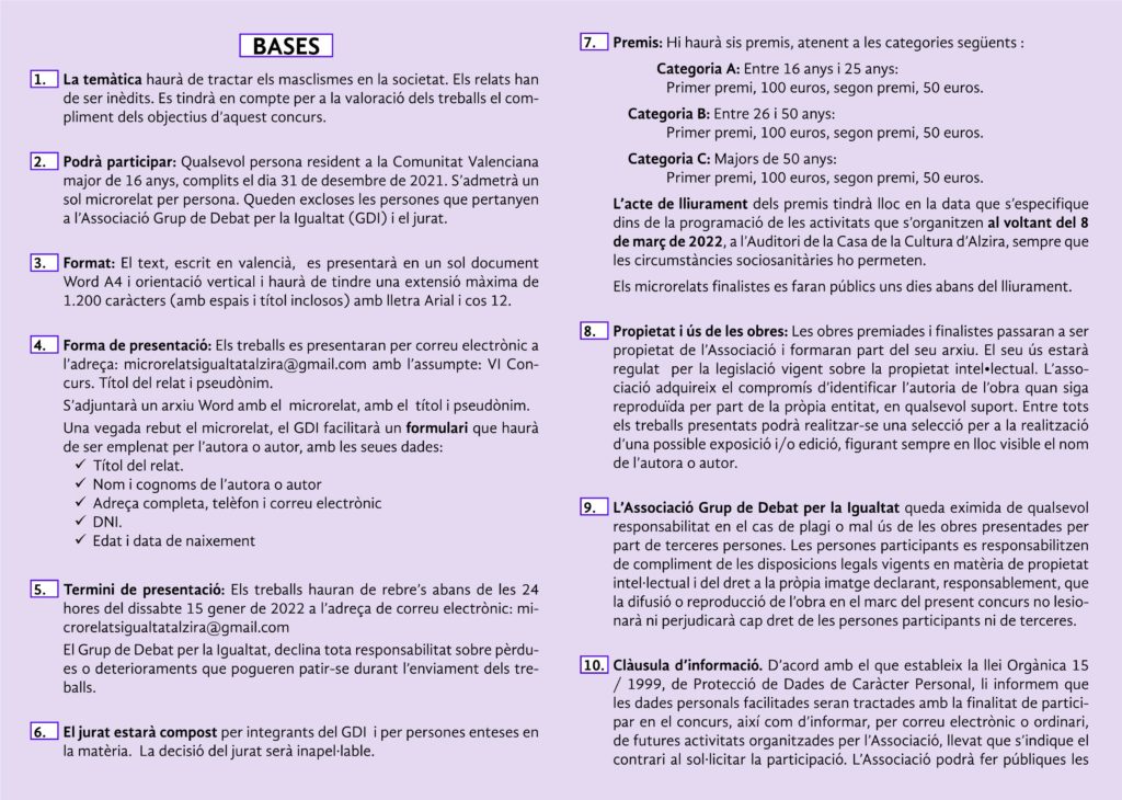 Com diu la base 5, els treballs s’hauran de rebre abans de les 24 hores del dissabte 15 gener de 2022, a l’adreça de correu electrònic: microrelats.igualtat.alzira@gmail.com.