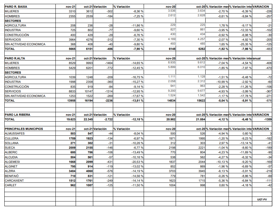 Según las cifras publicadas por el SERVEF, el paro registrado en el mes de noviembre del 2021 en la Ribera, se ha situado en 19623 personas, es decir, 2722 parados menos que en el mes de octubre, una disminución mensual del 12’18%.