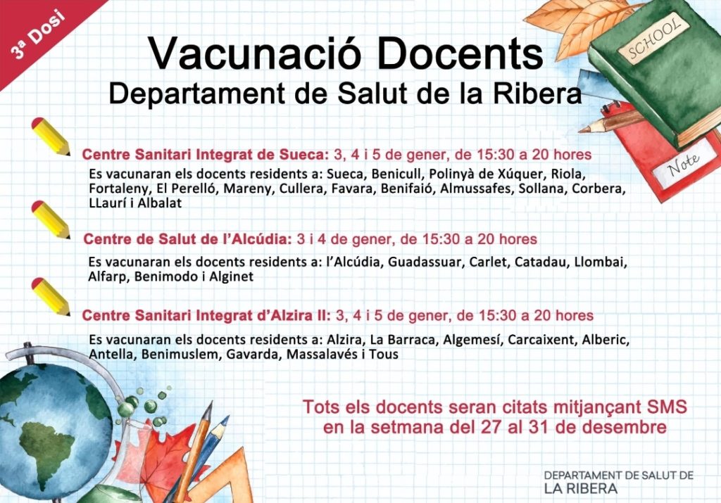 El Departament de salut de la Ribera informa de les proximes dates per les vacunacions al docents.
