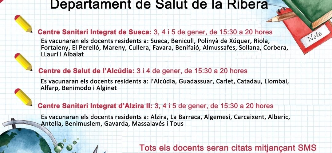 El Departament de salut de la Ribera informa de les proximes dates per les vacunacions al docents.