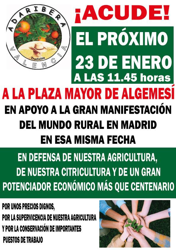 Algunas asociaciones independientes de agricultores de la Comunitat Valenciana como ADARIBERA (Ribera baja del Jucar) se unen a la manifestación que el próximo 23 de enero se desarrollará en Madrid.