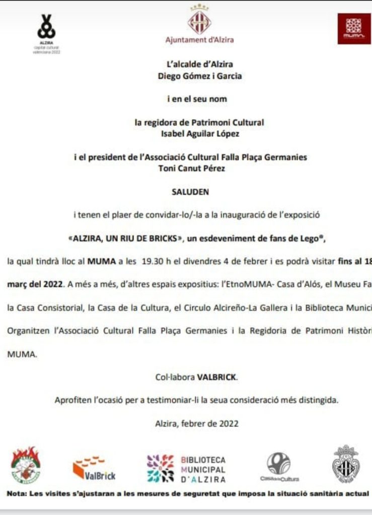 Anterior Alzira impulsa el concurs d’idees per al disseny del jardí «Memorial Luis Suñer Sanchis» Pròxim 14 centres educatius d’Alzira amb acreditació per rebre persones voluntàries d’Europa alzira, Informatius, Societat Alzira un riu de bricks al MUMA 26 enero, 20221 minuts vists Comentar Facebook Twitter WhatsApp Correu electrònic El MUMA acollirà des del pròxim 4 de febrer fins al 19, una exposició diferent, un esdeveniment per al fans de Lego. ALZIRA exposició Lego muma Fina Valiente Vore totes les publicacions També et pot agradar actualitat, Cultura, festes, Societat 👀🎞La novena i els assajos inicien l’agenda de les Festes de la Mare de Déu de la Salut 3 minuts vists actualitat, Informatius, Medi Ambient, Societat VIDEO/ Immobilitzades 80 tones d’olives i adobats diligències entregades en el Jutjat de Primera Instància d’Alzira. 3 minuts vists actualitat, ajuntament, alzira, Economía, Empreses VIDEO/ Acord de col·laboració entre l’Ajuntament i l’EGM de Materna 3 minuts vists Comentar Cancelar la respuestaTu dirección de correo electrónico no será publicada. Los campos obligatorios están marcados con *Comentario Nombre * Correo electrónico * Web Δ MAIGMAYO 12M12E CAMARENA eterniajoyeria novembre Idea 12 EMPRESES 12 COMERÇOS. JSR_ novembre Idea 12 EMPRESES 12 COMERÇOS.Asociación Empresarial AlziraDia de Promocions Especials