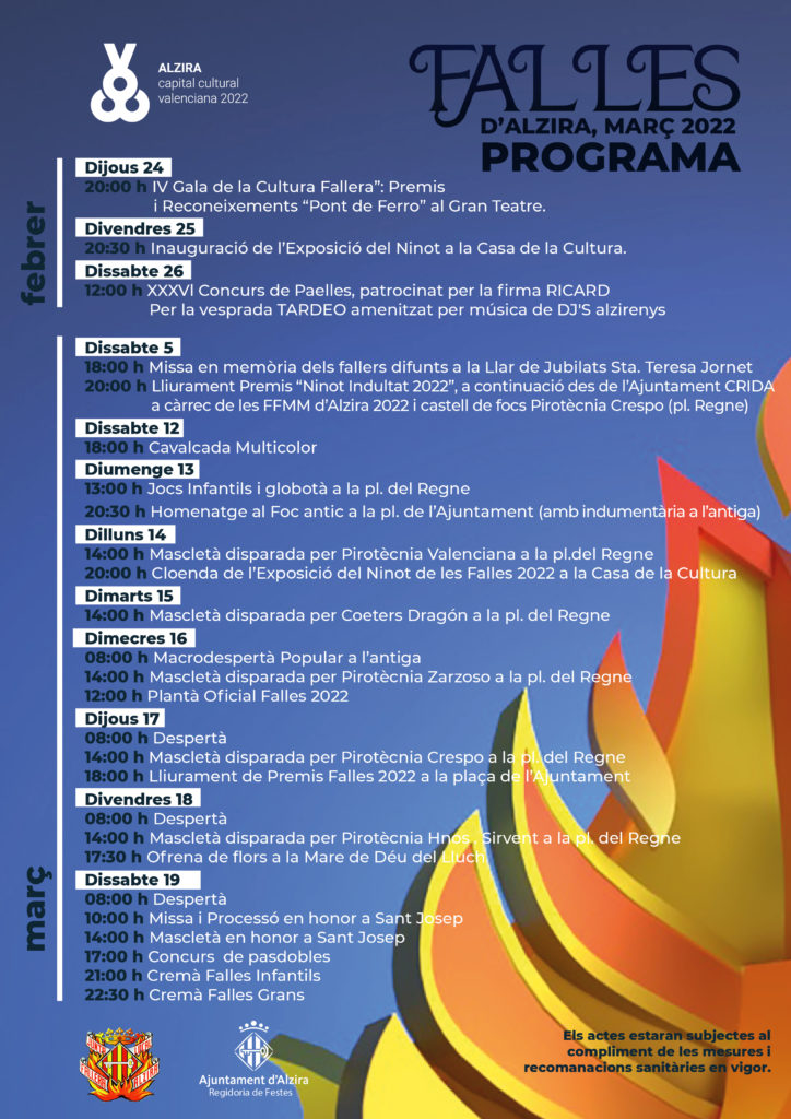 El dilluns 14 començaran les mascletaes, fins al 19 de març, que dispararan Pirotècnia Valenciana, Coeters Dragón, Pirotècnia Zarzoso, Pirotècnia Crespo, Hermanos Sirvent. El dijous 17 es farà el lliurament de Premis Falles 2022, a la plaça de l’Ajuntament, el divendres 18 a les 17.30 hores tindrà lloc l’ofrena a la Mare de Déu del Lluch, i el dissabte 19 de març, a les 17 hores serà el concurs de pasdobles. A les 21 hores es cremaran els monuments infantils i a les 22.30 hores, les falles grans.