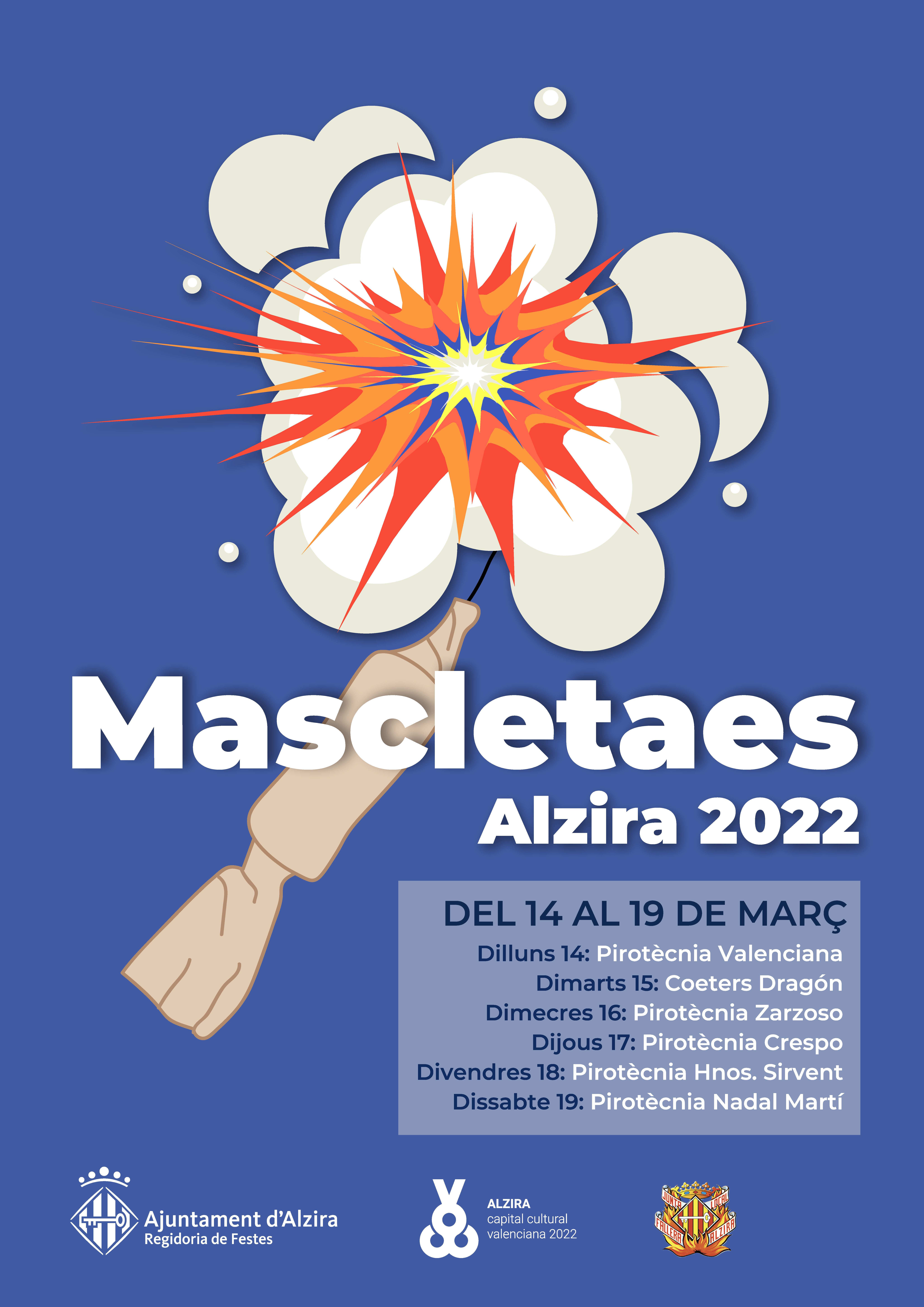 El dilluns 14 començaran les mascletaes, fins al 19 de març, que dispararan Pirotècnia Valenciana, Coeters Dragón, Pirotècnia Zarzoso, Pirotècnia Crespo, Hermanos Sirvent. El dijous 17 es farà el lliurament de Premis Falles 2022, a la plaça de l’Ajuntament, el divendres 18 a les 17.30 hores tindrà lloc l’ofrena a la Mare de Déu del Lluch, i el dissabte 19 de març, a les 17 hores serà el concurs de pasdobles. A les 21 hores es cremaran els monuments infantils i a les 22.30 hores, les falles grans.