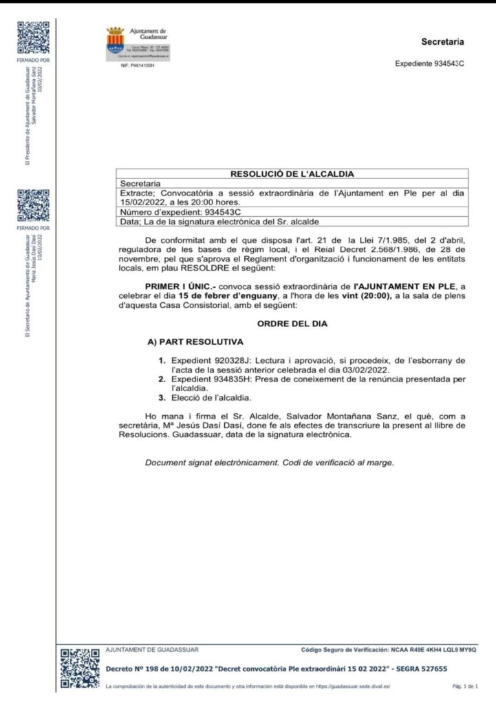 Ha arribat el moment! En compliment del pacte de governabilitat per a Guadassuar, demà dimarts 15 de febrer, en sessió extrtaordinària de l’Ajuntament en Ple, presentaré la meua renúncia a l’Alcaldia de Guadassuar i es farà l’elecció de qui ocuparà aquest càrrec.