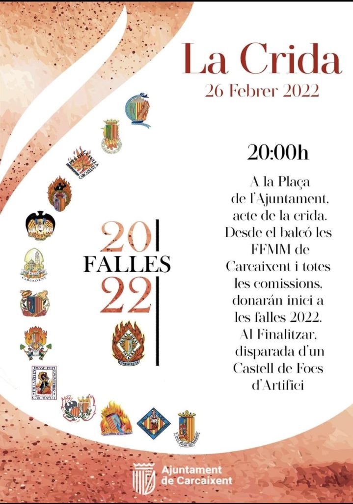 Els components de les 13 comissions falleres tindran el punt de trobada enfront de la Casa consistorial de Carcaixent on desde el Palacio de la Marquesa i a les 20:00 hores s’iniciarà la tradicional Cridá a carec de la Fallera Major 2022 Susi Payá i la Fallera Major Infantil Elisabeth Villar.