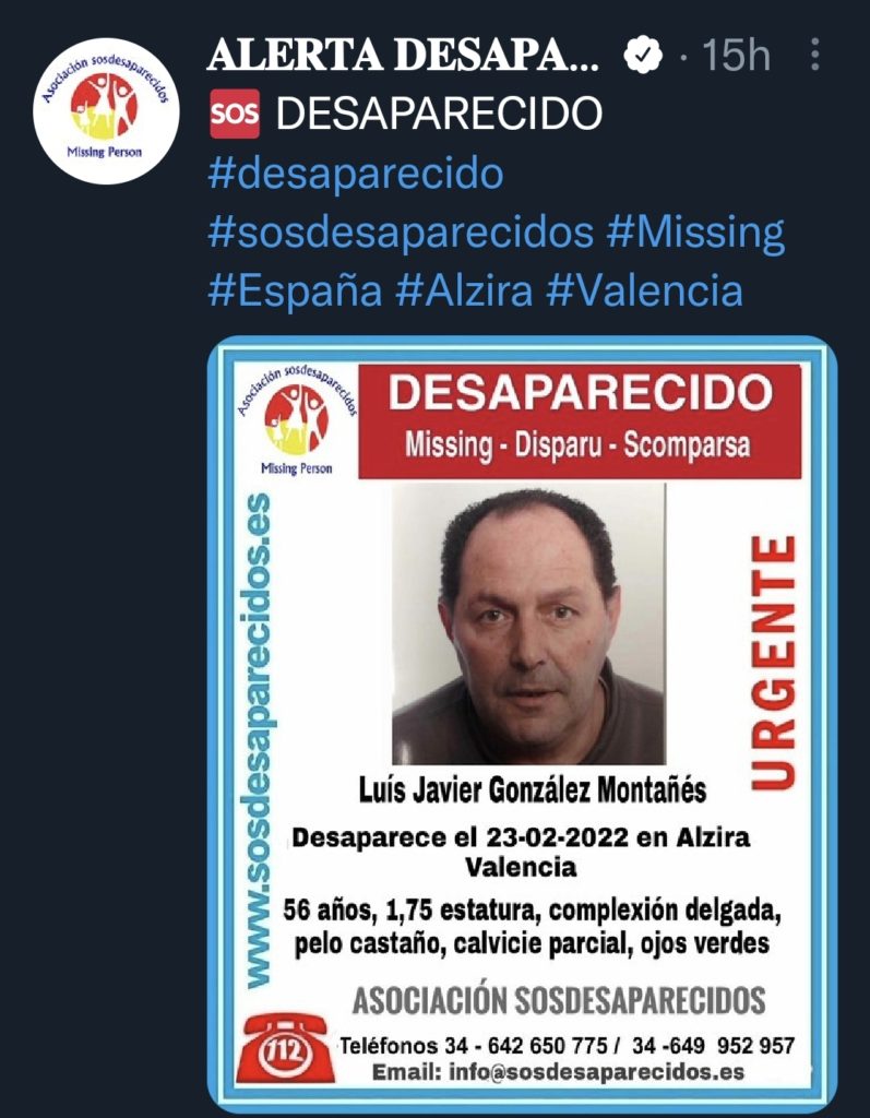 Luis Javier González Montañés de 56 años, 1,75 de altura, cabellos castaños y ojos verdes. Desapareció el pasado miércoles día 23 a Alzira donde reside según la asociación desaparecidos.