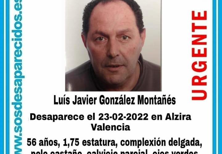 Luis Javier González Montañés de 56 años, 1,75 de altura, cabellos castaños y ojos verdes. Desapareció el pasado miércoles día 23 a Alzira donde reside según la asociación desaparecidos.