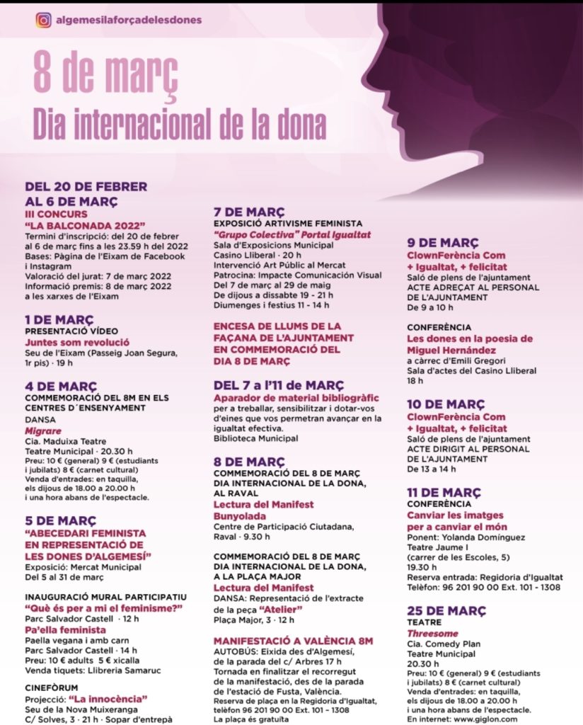 A la vesprada, la regidoria d’Igualtat ha posat al servei de la ciutadania un autobús gratuït que eixirà des del carrer dels Arbres a les 17 h per acudir a la manifestació de València. També aquest dia l’Eixam publicarà a les seues xarxes socials els balcons guanyadors del III Concurs Balconada, una iniciativa per fer una crida feminista als balcons on encara es pot participar fins al diumenge.