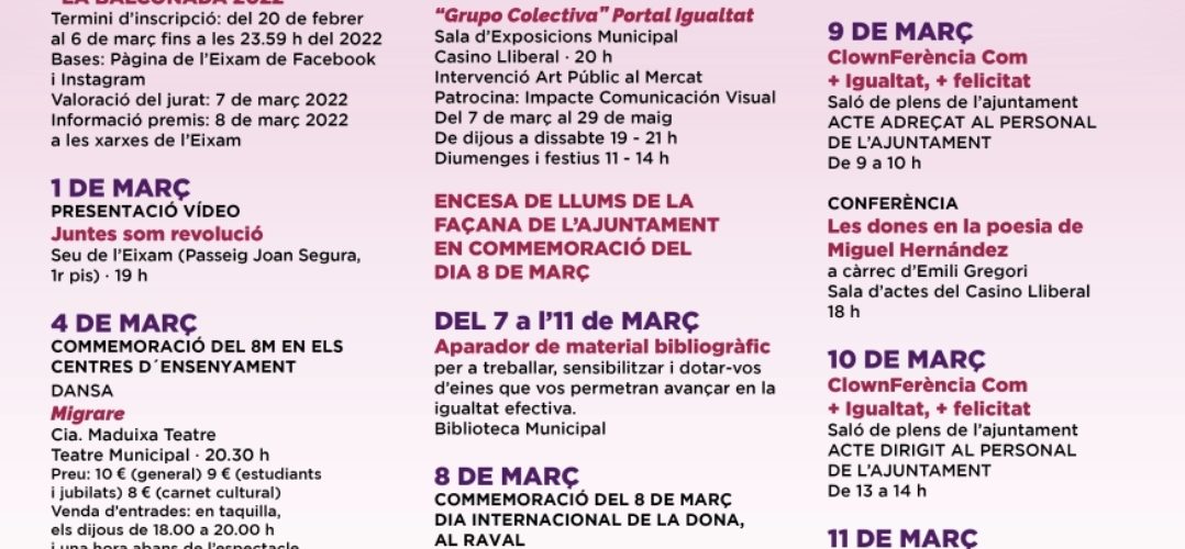 A la vesprada, la regidoria d’Igualtat ha posat al servei de la ciutadania un autobús gratuït que eixirà des del carrer dels Arbres a les 17 h per acudir a la manifestació de València. També aquest dia l’Eixam publicarà a les seues xarxes socials els balcons guanyadors del III Concurs Balconada, una iniciativa per fer una crida feminista als balcons on encara es pot participar fins al diumenge.