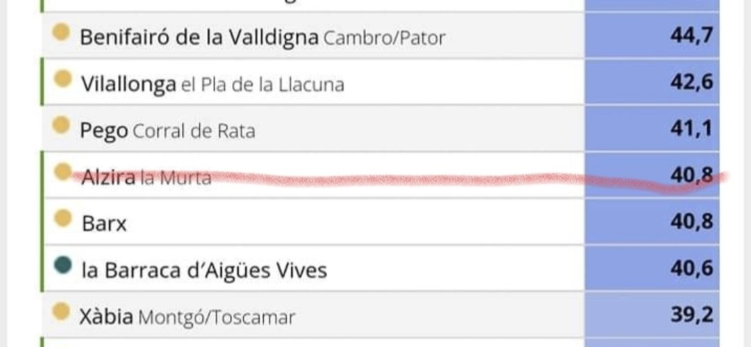 En segunda posición está el punto de la Murta con algo más de 40 litros y ya en la zona urbana, en l’Alquencia sobrepasan los 35 litros segun información de la asociación Avamet.
