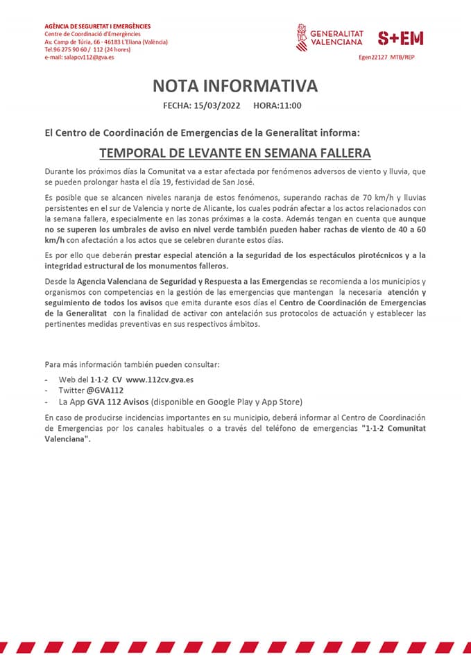 - El Centro de Coordinación de Emergencias advierte de la llegada de un TEMPORAL DE VIENTO Y LLUVIA que se prolongará hasta el 19 de marzo