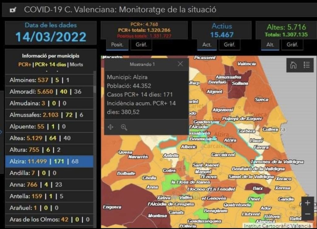 Segons l’actualització de dades de Conselleria, a data 14 de març tenim 171 casos i la incidència continua baixant per a situar-se en 380 casos cada 100.000 habitants.