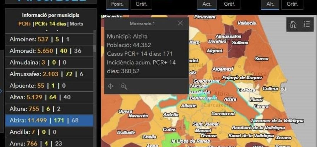 Segons l’actualització de dades de Conselleria, a data 14 de març tenim 171 casos i la incidència continua baixant per a situar-se en 380 casos cada 100.000 habitants.