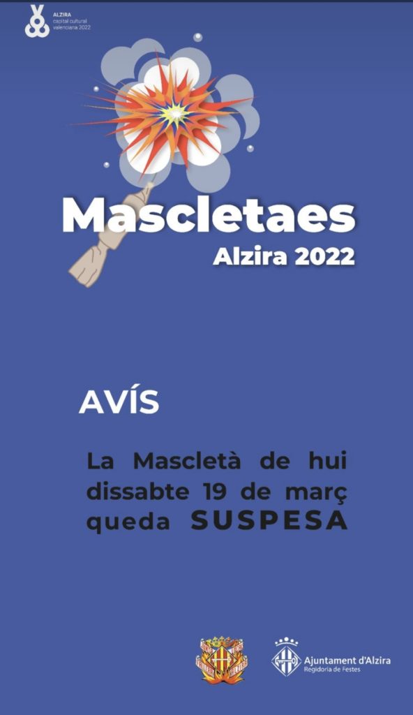 Després de parlar amb l’Ajuntament, l’executiva de JLF i la pirotècnia Nadal Marti, s’ha pres la decisiò de cancelar la MASCLETÀ de hui dia 19, per mesures de seguretat davant les previsions metereologiques i l’impossibiltat de montar-la.