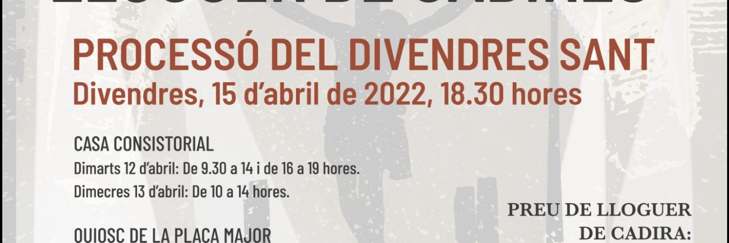 Des de l’Ajuntament ens informen de la venda- lloguer de les cadires per a presencial la processó General del sant enterrament del Divendres, Sant dia 15 d’abril de 2022