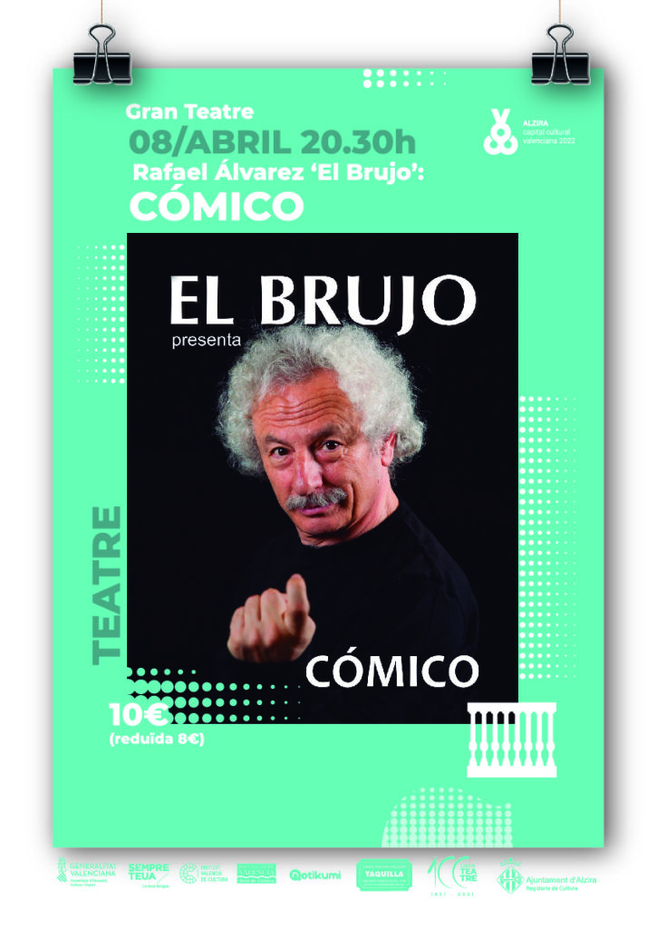 Divendres 8 d’abril de 2022. Gran Teatre, a les 20.30 hores Rafael Álvarez «El Brujo» presenta CÓMICO Actor solista: Rafael Álvarez, «El Brujo». Segons el mateix Rafael: Este espectacle és l’almànguena dels meus últims deu anys de teatre. Però què és l’almànguena? Diu Dario Fo: «Almànguena és el terme que empren els pintors quan, directament sobre el mur sec, abans d’enrasar, dibuixen el projecte del fresc. Únicament el dibuix». Jo estic fent el mateix, però a l’inrevés. Una labor de destil·lat.