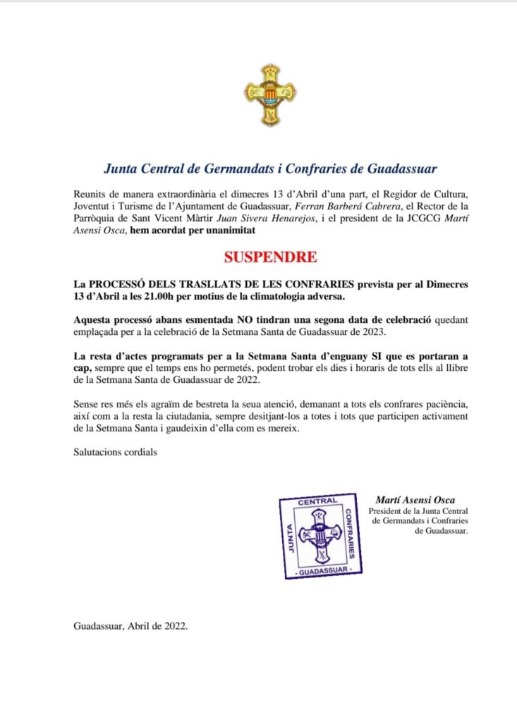 Se SUSPÉN la PROCESSÓ DELS TRASTALLS DE LES CONFRARIES hui, dimecres 13 d’abril, per motius de climatologia adversa. Este acte no tindrá una segona data de celebracio.