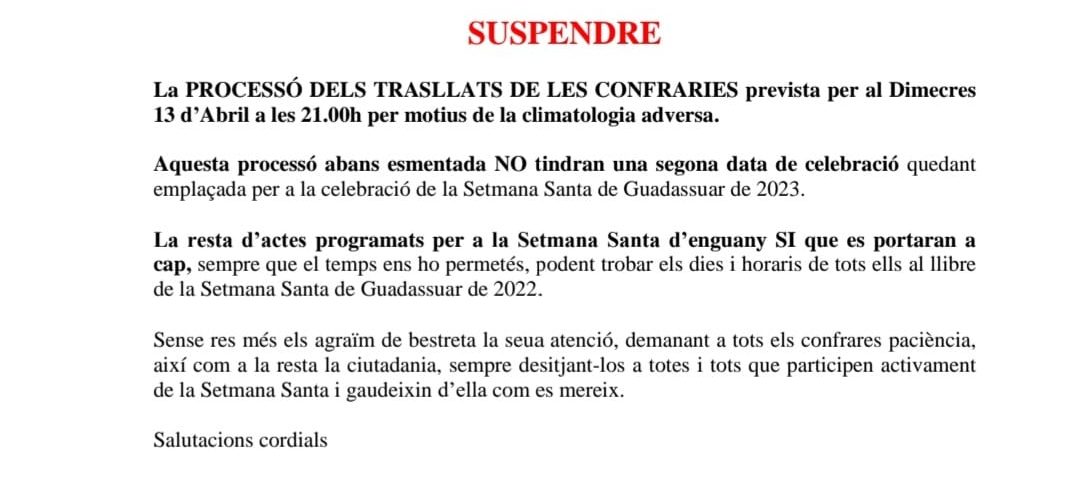 Se SUSPÉN la PROCESSÓ DELS TRASTALLS DE LES CONFRARIES hui, dimecres 13 d’abril, per motius de climatologia adversa. Este acte no tindrá una segona data de celebracio.