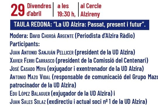 Anterior El 1º de Mayo, Día Internacional del Trabajo, fecha reivindicativa Pròxim Mig any fester a Carcaixent actualitat Taula renona «La UD Alzira passat, present i futur» 27 abril, 20221 minuts vists Comentar Facebook Twitter WhatsApp Correu electrònic La UD Alzira contínua les seues activitats relacionades amb el centenari de l’agrupació esportiva. En els últims dies d’aquest mes d’abril esta programada una taula redona amb diferents persones vinculades a l’equip blau grana centenari ESPORTS ud alzira Fina Valiente Vore totes les publicacions També et pot agradar actualitat 🎬👀 Programació Festes de la Mare de Déu de la Salut Algemesí 2024 5 minuts vists actualitat #FiraiFestesSueca2024, Presentacio Festera Major 1 minuts vists actualitat, Cultura, festes, Societat 👀🎞La novena i els assajos inicien l’agenda de les Festes de la Mare de Déu de la Salut 3 minuts vists Comentar Cancelar la respuestaTu dirección de correo electrónico no será publicada. Los campos obligatorios están marcados con *Comentario Nombre * Correo electrónico * Web Δ MAIGMAYO 12M12E CAMARENA eterniajoyeria novembre Idea 12 EMPRESES 12 COMERÇOS. JSR_ novembre Idea 12 EMPRESES 12 COMERÇOS.Asociación Empresarial AlziraDia de Promocions Especials