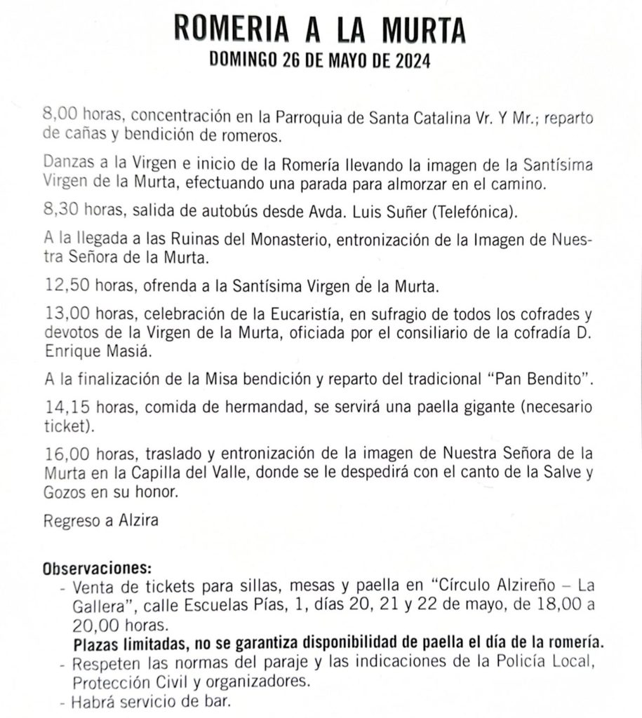 A les huit del matí, a la porta de l’església de Santa Caterina es farà la benedicció dels romers, els tradicionals balls a la Verge a càrrec del Grup de Danses d’Alzira que repetirán, com és costum, a les portes del paratge natural de la Murta després de la parada per a l’esmorzar., i començarà la caminada de huit kilòmetres fins al monestir.