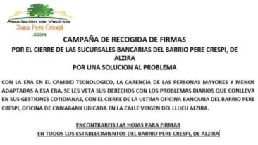 L’Associació de Veïns Zona Pere Crespi d’Alzira lluiten contra el tancament d’una sucursal bancària i contra l’administració...